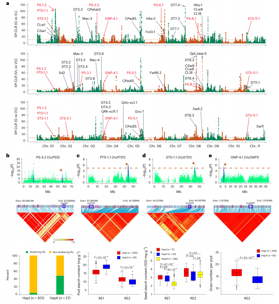 為了研究自然或人工選擇對豇豆分化的影響,作者通過選擇清除分析比較了三個豇豆亞群之間的基因組選擇特征,鑒定出239個與豇豆馴化和改良相關(guān)的基因。此外,通過GWAS,挖掘到裂莢性、莢長、單莢粒數(shù)、千粒重、可溶性糖、總淀粉和粗蛋白質(zhì)含量相關(guān)基因,并在遺傳群體中驗證。同時揭示了兩個亞種之間基因組結(jié)構(gòu)變異(SVs)的全圖譜,為豇豆在全基因組選擇下的馴化與改良提供了見解。產(chǎn)量性狀和品質(zhì)性狀的差異基因組選擇將有助于建立糧用豇豆和菜用豇豆雙向改良的遺傳資源。