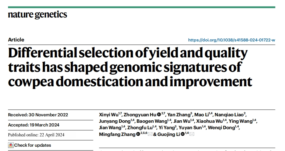 實驗方法:菜用豇豆G98,糧用豇豆G323 基因組Denovo;重測序GWAS:344份全世界收集的豇豆核心種質(zhì),其中包括342份栽培豇豆(87份糧用豇豆、244份菜用豇豆和11份未知用途豇豆)和2份野生豇豆;Illumina測序,10x深度;基因單倍型驗證:菜用豇豆地方品種 ‘ZN016’ 和菜用豇豆育成品種‘Zhijiang282構(gòu)建的RIL群體(183 lines)G98和G323構(gòu)建的F2群體(165 individuals)