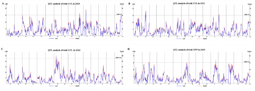 實驗方法:Xin24×Yushu10雜交中選擇212個F1材料: 特異性位點擴增片段測序(SLAF-seq);遺傳圖譜構(gòu)建;數(shù)量性狀位點(QTL)定位;GWAS關(guān)聯(lián)(F1群體)