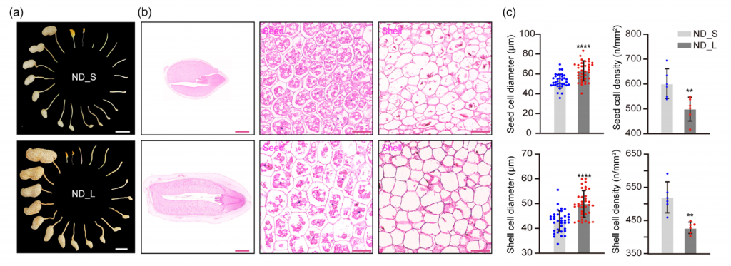 實驗方法:莢果大小/重量差異顯著2份Virginia-type花生材料( ND _ L和ND _ S)雜交,產(chǎn)生遺傳群體;F2:3群體BSA-seq(20+20混池);F6:7 和F6:8群體精細定位;基因克??;系統(tǒng)進化分析;亞細胞定位;免疫熒光;酵母雙雜交;pull-down;CO-IP;番茄擬南芥轉(zhuǎn)化實驗等。