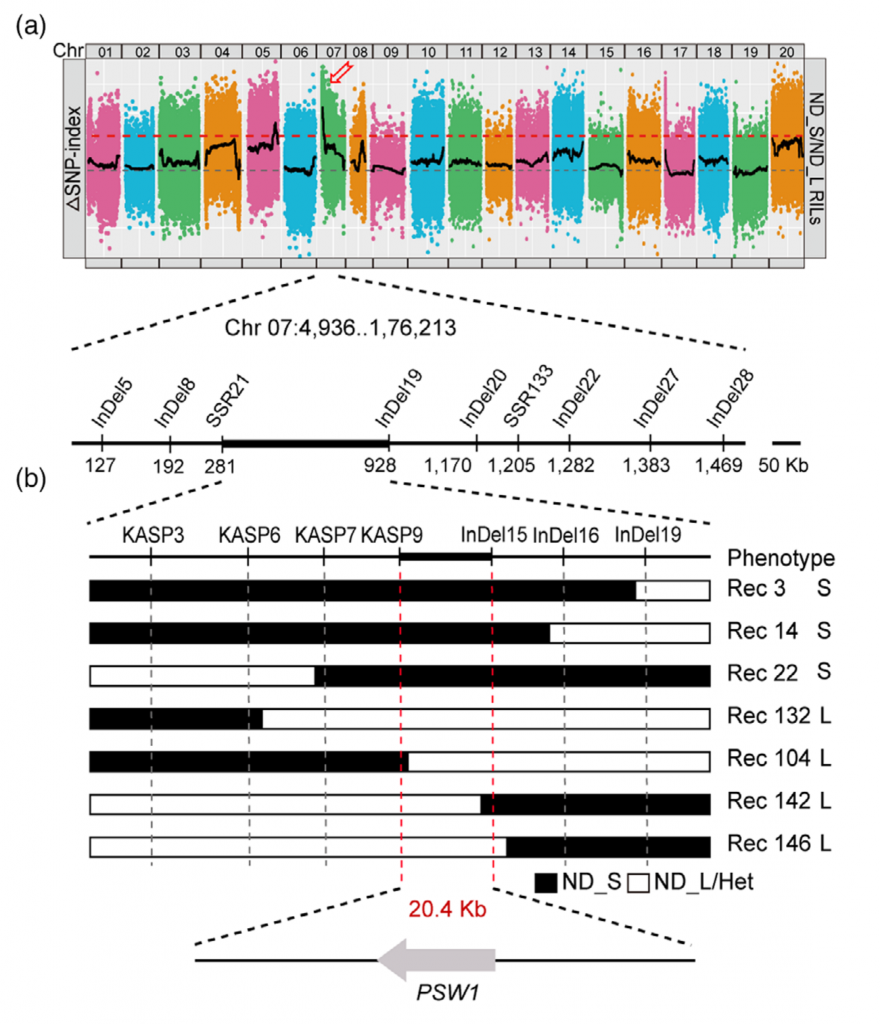花生莢果大小是決定花生產(chǎn)量的關(guān)鍵農(nóng)藝性狀,為了鑒定控制花生莢果大小的基因,該研究對188份核心種質(zhì)進行鑒定,并選取莢果大小/重量差異顯著的2份花生材料構(gòu)建F2群體,BSA-Seq獲得了288.58 Gb的原始數(shù)據(jù)。利用285914個高質(zhì)量SNPs 和70 759個 InDel,將控制莢果大小的基因定位在07染色體1.17 Mb的區(qū)間內(nèi)。作者從F6:7和F6:8群體中開發(fā)了15個多態(tài)性標(biāo)記并對個體進行基因分型,精細定位QTL到KASP 9 和In Del15之間20.4 kb的區(qū)間內(nèi)。該區(qū)間僅包含1個預(yù)測的非同義突變基因和InDels,將該基因命名為PSW1。