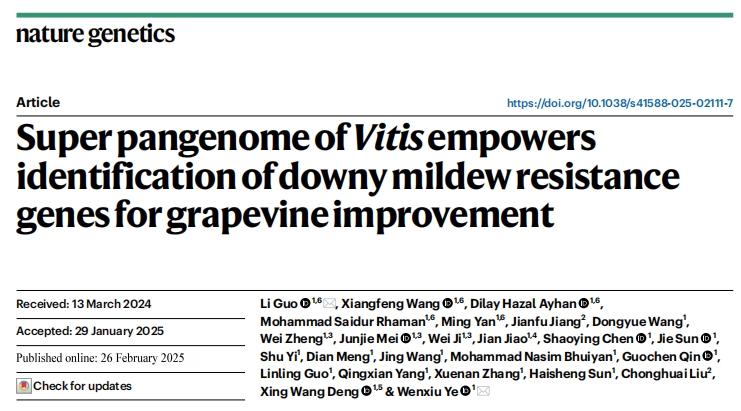 2025年02月26日,濰坊現(xiàn)代農業(yè)山東省實驗室、北京大學現(xiàn)代農業(yè)研究院葉文秀研究員和郭立研究員團隊在國際期刊《自然-遺傳學(Nature Genetics)》上在線發(fā)表了題為Super pangenome of Vitis?empowers identification of downy mildew resistance genes for grapevine improvement的研究成果。作為葡萄科研領域里程碑式的重大突破,繪制了涵蓋葡萄屬的歐亞、北美和東亞世界三大種群的72個葡萄種質材料的單倍型超級泛基因組圖譜,揭示葡萄屬豐富遺傳多樣性和雜交歷史,基于葡萄多組學數(shù)據(jù),挖掘到葡萄霜霉病抗性相關遺傳變異和抗病基因,加速葡萄精準分子育種,開啟葡萄種質創(chuàng)新和利用新時代。百邁客生物為該研究提供了基因組、hic、轉錄組等測序服務。
