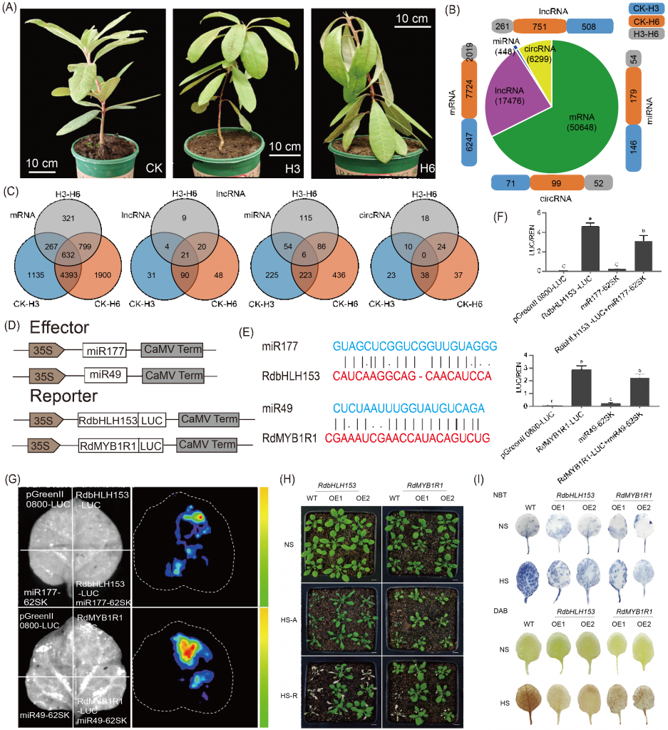 圖2. miRNA和靶基因的全轉(zhuǎn)錄組分析及功能驗證 (A)R. delavayi的對照(CK)和熱處理(H3和H6);(B)mRNA、lncRNA、miRNA和circRNA的鑒定和差異表達(dá)分析;(C)三種比較中特異性和常見的差異表達(dá)RNA;(D)效應(yīng)器和報告器結(jié)構(gòu)圖;(E)miR49和miR177靶點突變示意圖;(F)熒光素酶測定統(tǒng)計。誤差條表示三個重復(fù)的SEs(*,p?< 0.05)。(G)熒光素酶成像分析;(H)RdbHLH153和RdMYB1R1的過表達(dá)增強了耐熱性。NS表示無熱應(yīng)激,HS-A表示36 h熱應(yīng)激,HS-R表示36 h熱處理后在常溫下恢復(fù)5天;(I)二氨基聯(lián)苯胺(DAB)和硝基藍(lán)四氮唑(NBT)染色法檢測轉(zhuǎn)基因株系和WT在無熱脅迫(NS)和熱脅迫(HS)下的H2O2和O?2。