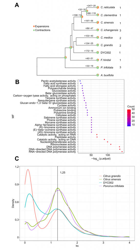 柑橘是世界上種植最廣泛的水果之一,目前在140多個(gè)國家和地區(qū)種植。雖然過去的二十年里柑橘植物的種群結(jié)構(gòu)和遺傳多樣性已被調(diào)查,但由于其豐富的資源類型和雜交頻繁,許多柑橘物種的起源和進(jìn)化仍不清楚。野生柑橘物種和原始柑橘保存了豐富的遺傳資源和遺傳多樣性,可用于闡明柑橘物種的起源和進(jìn)化。2015年,在西雙版納發(fā)現(xiàn)一棵200多年的野生柑橘樹大翼葉柑橘(DYC002),被認(rèn)為是研究柑橘進(jìn)化及苦味馴化的很好材料。