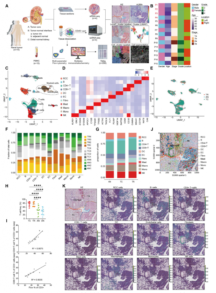 研究材料:15名腎切除術(shù)的ccRCC患者組織樣本及其血液PBMC。對(duì)組織樣本區(qū)域進(jìn)行定義,分為腫瘤核心(TC),腫瘤-健康交界(IF,包括腫瘤邊緣TR和臨近健康腎組織AN),遠(yuǎn)端健康腎組織DN。