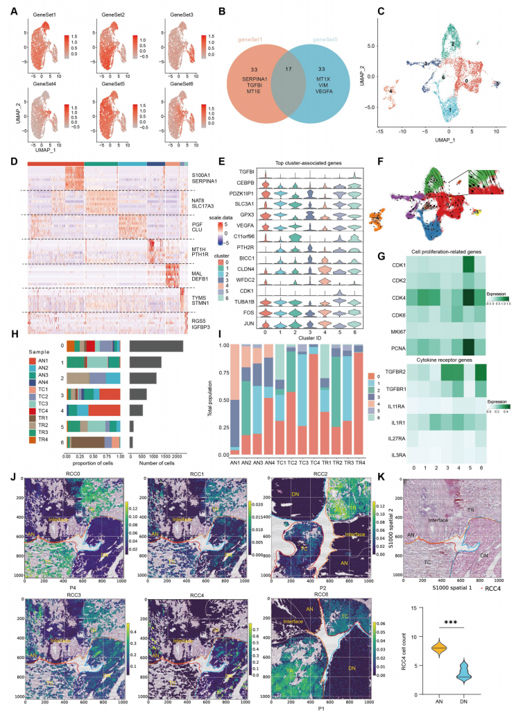 進(jìn)一步分析,發(fā)現(xiàn)ccRCC亞群0~4簇與不同基因集表達(dá)譜匹配,5和6簇不與任何基因集匹配但具有細(xì)胞周期和應(yīng)激響應(yīng)相關(guān)基因表達(dá)。RCC0簇和RCC2簇代表EMThigh腫瘤細(xì)胞并在IF區(qū)域富集,RCC1簇代表PT(近曲小管)細(xì)胞,擬時(shí)序分析結(jié)果顯示存在RCC0—>RCC2分化關(guān)系,但RCC2幾乎只在P2患者樣本中發(fā)現(xiàn),表明RCC2可能與個(gè)別患者特征相關(guān)。RCC1、RCC3和RCC4細(xì)胞主要在組織而不是腫瘤區(qū)域富集,RCC4主要分布在AN和DN區(qū)域,RCC4在AN區(qū)域分布數(shù)量高于DN區(qū)域。RCC4高表達(dá)細(xì)胞因子受體基因,表明TME中分泌的促腫瘤細(xì)胞因子可能傾向于作用到RCC4,增加其轉(zhuǎn)變成癌細(xì)胞的概率,加速腫瘤逃逸,促進(jìn)腫瘤惡性化,與以往瘤旁附近不是完全的健康組織認(rèn)識(shí)相符合。