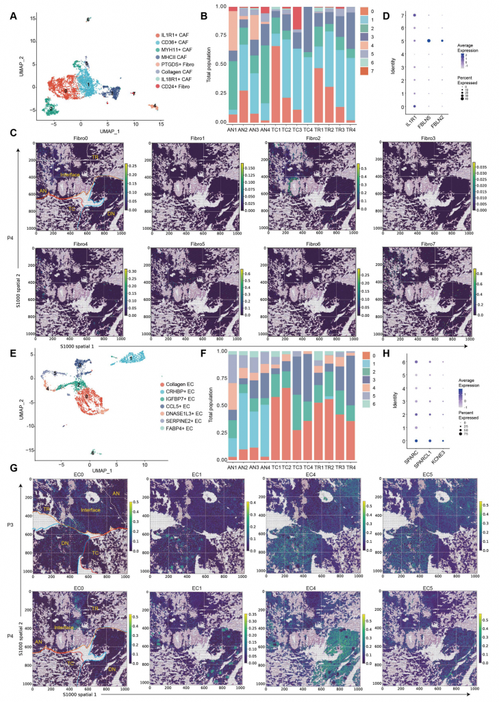 scRNA-seq與空間數(shù)據(jù)均顯示,ccRCC存在8種激活的成纖維細(xì)胞簇,腫瘤區(qū)域成纖維細(xì)胞數(shù)量高于健康組織,其中CD24+IL32+成纖維細(xì)胞顯著富集在腫瘤區(qū)域,PTGDS+成纖維細(xì)胞幾乎全分布在AN,高表達(dá)ECM(胞外基質(zhì))形成和EMT的成纖維細(xì)胞簇在IF較為富集,IL1R1+?CAF(腫瘤相關(guān)成纖維細(xì)胞)表現(xiàn)出腫瘤促進(jìn)表型;7種EC(內(nèi)皮細(xì)胞)簇中4種(0,2,3和6)主要富集在腫瘤組織,3種(1,4和5)在健康組織富集,膠原蛋白EC(0簇)豐度最高,具有促腫瘤特征??傊?strong>不同的ECM蛋白質(zhì)產(chǎn)生基質(zhì)細(xì)胞傾向于富集在IF并共定位,可能行駛多種功能,包括細(xì)胞-細(xì)胞交互和胞外組分重構(gòu)。