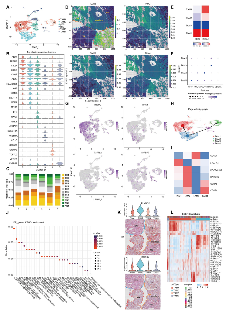 scRNA-seq數(shù)據(jù)與空間數(shù)據(jù)均顯示,4種TAM簇具有不同分布趨勢(shì),TAM1主要分布在TC區(qū)域;TAM2高表達(dá)FOLR2、MRC1和CD163,可能是M2樣巨噬細(xì)胞且具有增強(qiáng)的免疫抑制特征,TAM4是組織駐留巨噬細(xì)胞,兩者主要分布在TR區(qū)域;TAM3表達(dá)炎癥響應(yīng)相關(guān)基因,在TR和AN區(qū)域富集。RNA速率分析顯示存在TAM4—>TAM2—>TAM1和TAM4—>TAM3兩種軌跡,以及從IF區(qū)域遷移到TC區(qū)域的趨勢(shì)。進(jìn)一步的功能分析顯示,IF區(qū)域的TAM2可能通過(guò)促進(jìn)EMT,TC區(qū)域的TAM2可能通過(guò)促進(jìn)腫瘤血管生成,起到促癌效應(yīng)??傊?,TAM2不同的腫瘤促進(jìn)效應(yīng)可能與免疫抑制TME有關(guān)。
