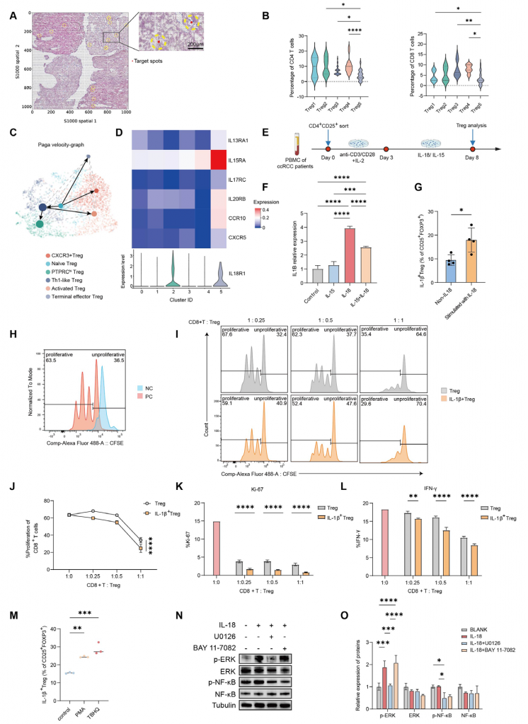 空間轉(zhuǎn)錄組數(shù)據(jù)結(jié)果顯示不同Treg細(xì)胞100μm范圍內(nèi)激活的CD4+/CD8+ T細(xì)胞數(shù)量較少,終末效應(yīng)Treg細(xì)胞100μm范圍內(nèi)CD4+/CD8+ T細(xì)胞數(shù)量更少,表明終末效應(yīng)Treg細(xì)胞周?chē)鷳?yīng)答Treg細(xì)胞(Tresp)增殖受到更強(qiáng)的抑制。細(xì)胞共培養(yǎng)實(shí)驗(yàn)表明終末效應(yīng)Treg細(xì)胞具有強(qiáng)免疫抑制功能。RNA速率分析結(jié)果表明效應(yīng)終末Treg可能由初始Treg細(xì)胞分化而來(lái),體外實(shí)驗(yàn)表明IL-18可刺激CD4+CD25+ Treg細(xì)胞上調(diào)IL-1β表達(dá),表明終末效應(yīng)Treg細(xì)胞產(chǎn)生和作用可能與IL-18有關(guān)。ERK激活劑/NF-κB激活劑促進(jìn)IL-18+ Treg細(xì)胞的產(chǎn)生,IL-18處理后Treg細(xì)胞ERK/NF-κB磷酸化水平增加,ERK抑制劑可抑制Treg細(xì)胞表達(dá)NF-κB但NF-κB抑制劑無(wú)法抑制ERK表達(dá),綜上,這些結(jié)果表明IL-18可能通過(guò)ERK/NF-κB通路介導(dǎo)終末效應(yīng)Treg細(xì)胞的產(chǎn)生。