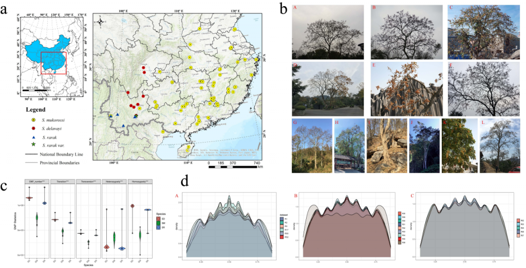 圖1?無患子屬種質(zhì)分布及單核苷酸多態(tài)性(SNP)?統(tǒng)計分析