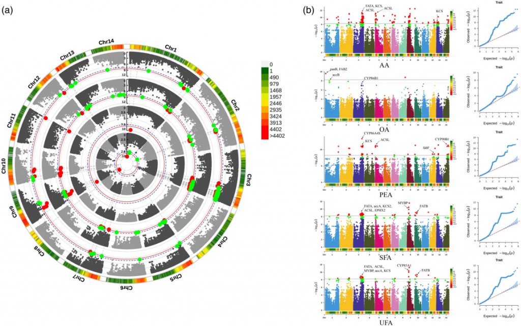 鎖定油脂合成關(guān)鍵位點:通過全基因組關(guān)聯(lián)分析(GWAS),團隊識別出影響種仁油脂組成的多個關(guān)鍵基因(如ACSL、FAD2、FAB2等),為高品質(zhì)油料品種的選育提供了精準(zhǔn)靶點。