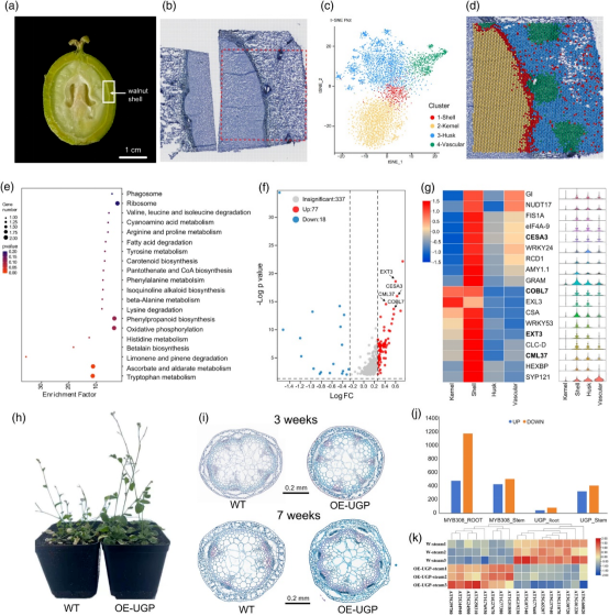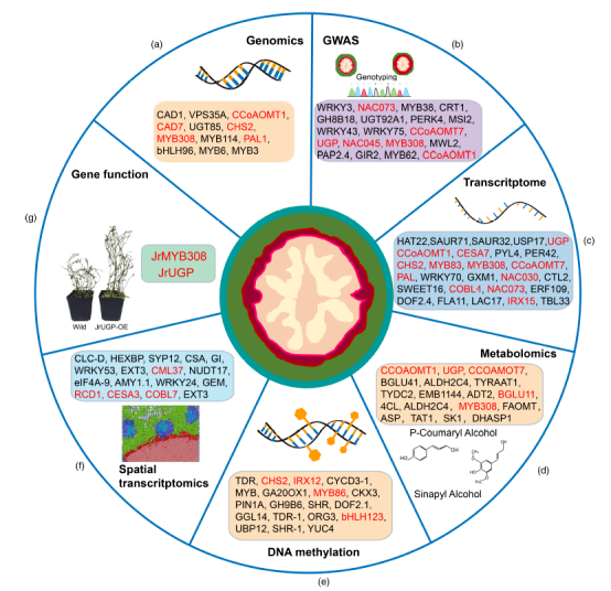 通過對十一個(gè)發(fā)育階段的轉(zhuǎn)錄組學(xué)、代謝組學(xué)、DNA甲基化和空間轉(zhuǎn)錄組學(xué)等多組學(xué)分析,揭示了多個(gè)與次生細(xì)胞生物合成和木質(zhì)素積累相關(guān)的候選基因,例如UGP、MYB308、MYB83、NAC043、NAC073、CCoAOMT1、CCoAOMT7、CHS2、CESA7、LAC7、COBL4和IRX12。在擬南芥(Arabidopsis thaliana)中過表達(dá)JrUGP和JrMYB308驗(yàn)證了它們在木質(zhì)素生物合成和細(xì)胞壁加厚中的作用。
