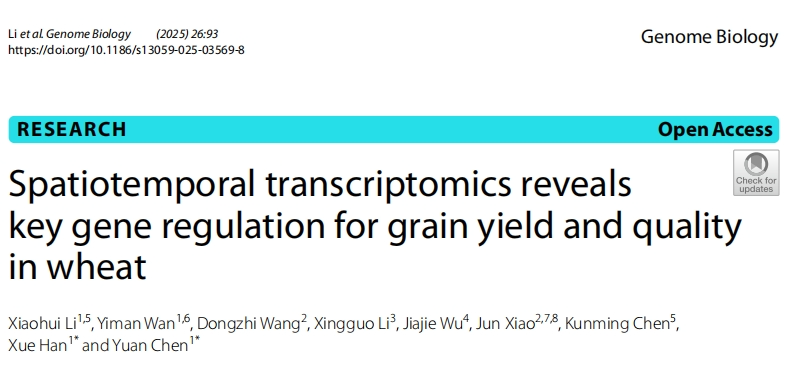 2025年4月11日,北京大學現(xiàn)代農(nóng)業(yè)研究院研究團隊在Genome Biology發(fā)表研究論文。題為”Spatiotemporal transcriptomics reveals key gene regulation for grain yield and quality in wheat”。