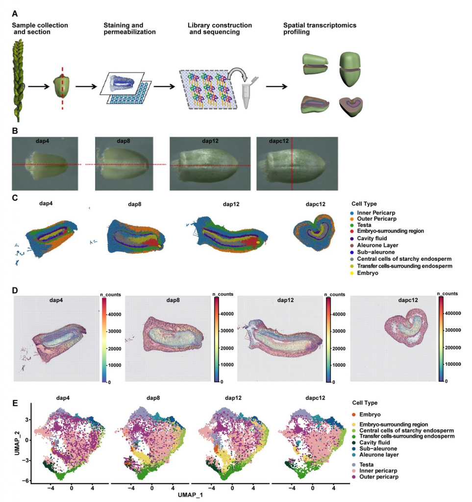 小麥(Triticum aestivum L.)是全球三大主糧作物之一,種植面積約2.3億公頃,其產(chǎn)量提升對保障全球糧食安全與營養(yǎng)供給至關(guān)重要。小麥籽粒主要由三部分組成:二倍體胚、三倍體胚乳及果皮(種皮)。這些組織在發(fā)育過程中表現(xiàn)出顯著的基因表達時空特異性,形成功能分化的區(qū)室化結(jié)構(gòu)。盡管這些組織在細胞類型和生理功能上存在明顯差異,但它們通過協(xié)同調(diào)控構(gòu)建了獨特的籽粒發(fā)育微環(huán)境,共同決定籽粒的最終表型。然而,目前對籽粒細胞類型的認知仍主要依賴于形態(tài)學觀察和少量標記基因的表達分析,常規(guī)轉(zhuǎn)錄組數(shù)據(jù)因缺乏空間分辨率,極大限制了對籽粒發(fā)育調(diào)控機制的深入解析及關(guān)鍵功能基因的挖掘。