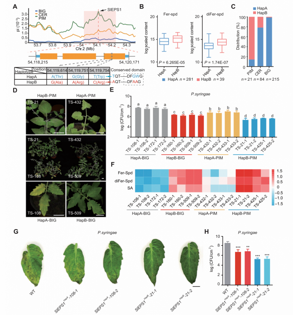 通過比較不同番茄亞群中SlEPS1位點(diǎn)的核苷酸多樣性,發(fā)現(xiàn)該基因可能受人工選擇影響。變異組分析發(fā)現(xiàn)番茄群體間有兩個(gè)不同的SlEPS1單倍型組合:SlEPS1HapA和SlEPS1HapB,其中SlEPS1HapB的植株中酚胺和SA水平更高,抗病性更強(qiáng)。這些結(jié)果表明,在番茄的馴化選擇過程中,SlEPS1HapB的消失可能是導(dǎo)致番茄抗病性降低的原因之一(圖2)。