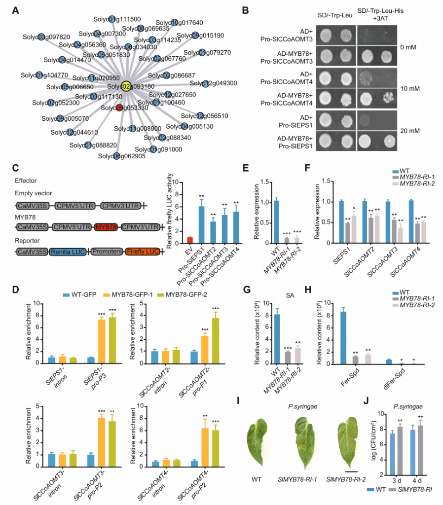 此外,研究還發(fā)現(xiàn)了一個(gè)與BGC2顯著共表達(dá)的轉(zhuǎn)錄因子SlMYB78。它能夠直接結(jié)合并激活BGC2基因簇的啟動子,從而調(diào)控BGC2基因簇的表達(dá)。當(dāng)SlMYB78基因被沉默時(shí),酚胺和水楊酸的含量顯著下降,導(dǎo)致其抗病能力降低(圖3)。