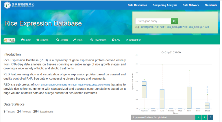 ☆?水稻基因表達(dá)庫RED:是一個(gè)基因表達(dá)譜存儲庫,對跨越整個(gè)水稻生長階段的組織進(jìn)行?RNA-Seq?數(shù)據(jù)分析,涵蓋各種生物和非生物處理。