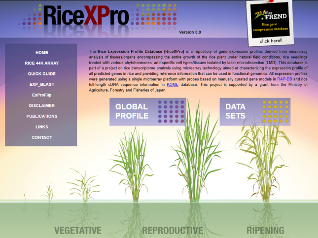 ☆?水稻表達(dá)譜數(shù)據(jù)庫RiceXPro:針對水稻植物在自然田間條件下的整個(gè)生長過程、用各種植物激素處理的水稻幼苗以及通過激光顯微切割(LMD) 分離的特定細(xì)胞類型/組織,使用微陣列技術(shù)進(jìn)行水稻轉(zhuǎn)錄組分析,旨在表征水稻中所有預(yù)測基因的表達(dá)譜。