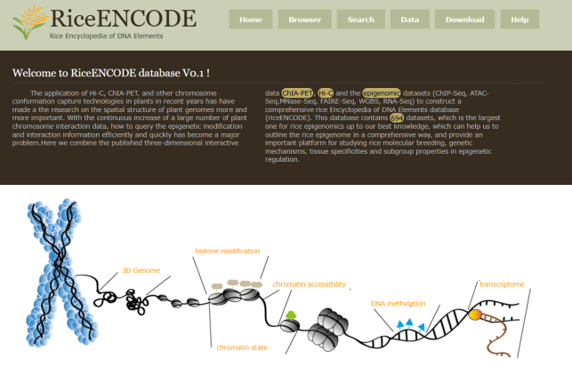 ☆?水稻多元表觀基因組數(shù)據(jù)的數(shù)據(jù)庫RiceENCODE:該數(shù)據(jù)庫收集了包括ChIP-seq,ATAC-seq, MNase-seq, FAIRE-seq, BS-seq, RNA-seq, ncRNA-seq, Hi-C和ChIA-PET?等水稻高通量數(shù)據(jù),可查詢不同品種、不同組織、不同染色體區(qū)段交互信息,兩兩基因之間交互網(wǎng)絡(luò)等。