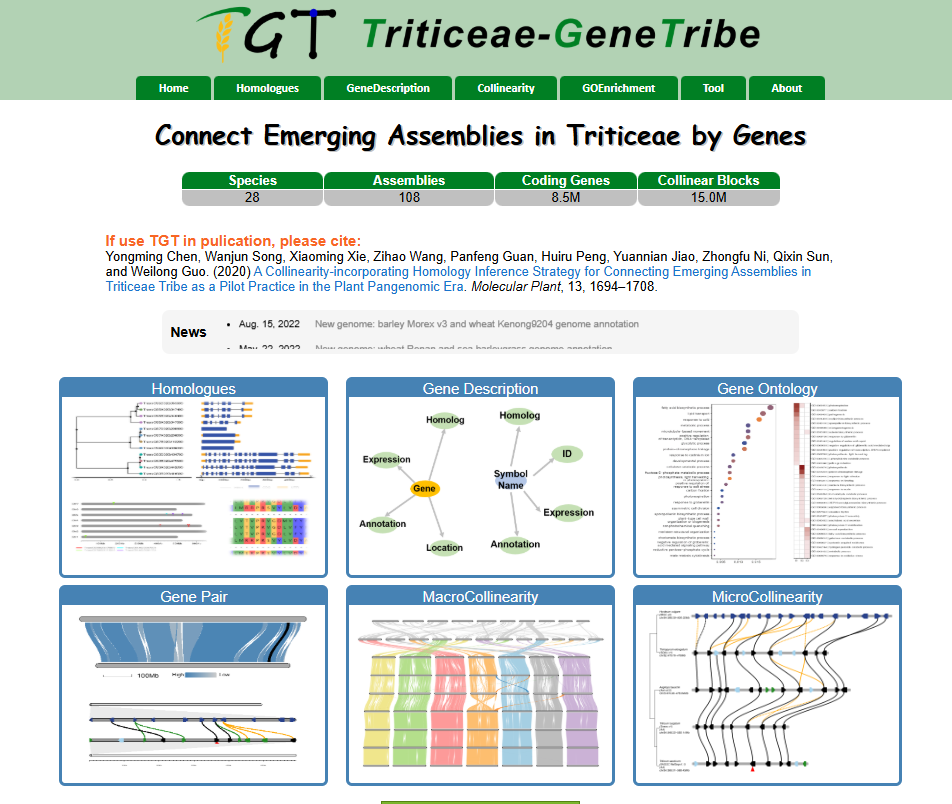 ☆?小麥族同源基因數(shù)據(jù)庫TriticeaeGeneTribe:利用小麥族物種中已發(fā)表的基因組,對不同參考基因組間同源基因鑒定,構(gòu)建了小麥族同源基因數(shù)據(jù)庫。同時(shí),數(shù)據(jù)庫具有基因功能查詢,GO富集分析,同源基因查詢,基因組區(qū)間共線性分析等功能。