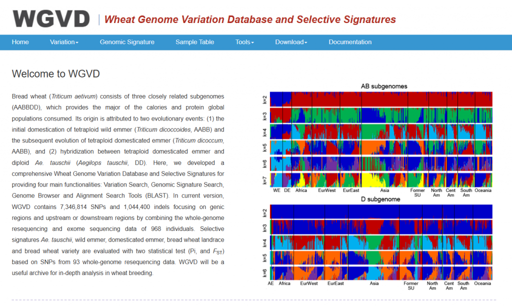 ☆?小麥基因組變異與選擇信號數(shù)據(jù)庫WGVD:匯總了從968個(gè)面包小麥及其祖先中收集到的SNPs、indels,以及基于93個(gè)小麥全基因組重測數(shù)據(jù)的SNPs評估的小麥馴化和改良過程中的選擇特征。數(shù)據(jù)庫主要提供變異、基因組選擇信號搜索、基因組瀏覽和比對功能。