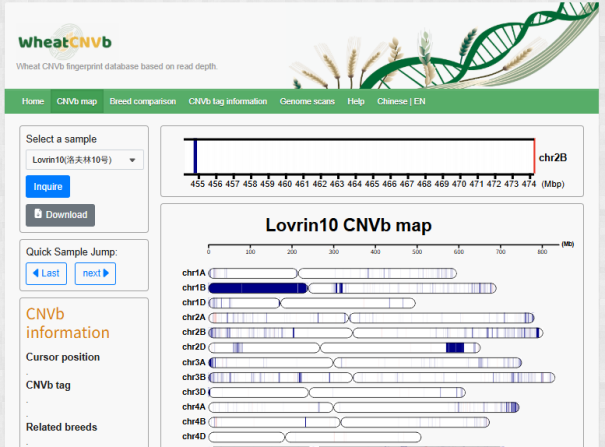 ☆?小麥WheatCNVb數(shù)據(jù)庫:基于小麥CNVb新型分子標(biāo)記系統(tǒng),支持查詢小麥種質(zhì)資源的CNVb標(biāo)記,可視化CNVb指紋,并進(jìn)行基于CNVb指紋的品種比較。
