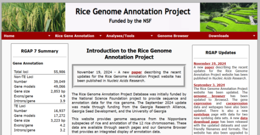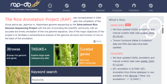 ☆?水稻基因組注釋項(xiàng)目數(shù)據(jù)庫RGAP與水稻注釋計(jì)劃RAP:旨在提供水稻日本晴基因組的序列和注釋數(shù)據(jù)。該網(wǎng)站提供基因組序列和12條水稻染色體的注釋,基因的分布,或者根據(jù)基因名稱查找基因的功能和序列、下載數(shù)據(jù)或使用blast搜索同源基因。