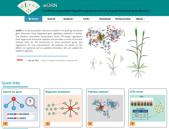 ☆?利用整合基因調(diào)控網(wǎng)絡(luò)探索小麥功能基因的交互式平臺wGRN:提供了基因調(diào)控查詢、功能基因預(yù)測和QTG挖掘等十余個(gè)功能模塊,建立了小麥整合基因調(diào)控網(wǎng)絡(luò),實(shí)現(xiàn)了可持續(xù)整合大規(guī)模調(diào)控?cái)?shù)據(jù)集的網(wǎng)絡(luò)化研究框架。