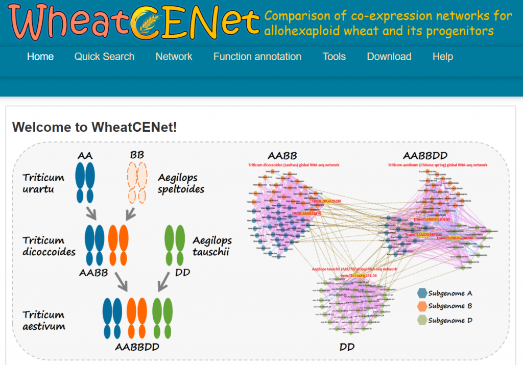 ☆?異源六倍體小麥及其祖先的比較共表達(dá)網(wǎng)絡(luò)分析數(shù)據(jù)庫WheatCENet:集成了功能注釋,蛋白質(zhì)-蛋白質(zhì)相互作用、miRNAs,GO注釋、GSEA等工具能夠搜索和比較特定的功能共表達(dá)網(wǎng)絡(luò),識別其中聚集的基因的相關(guān)功能。
