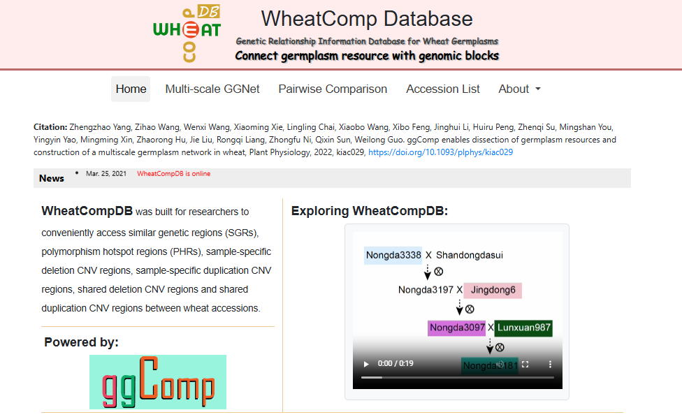☆?小麥種質(zhì)資源血緣區(qū)間比較數(shù)據(jù)庫WheatCompDB:主要針對數(shù)據(jù)集中任意兩個(gè)樣本間的種質(zhì)資源血緣區(qū)間比較分析,支持基因組水平、染色體水平和局部區(qū)間水平下種質(zhì)資源網(wǎng)絡(luò)的構(gòu)建和挖掘。
