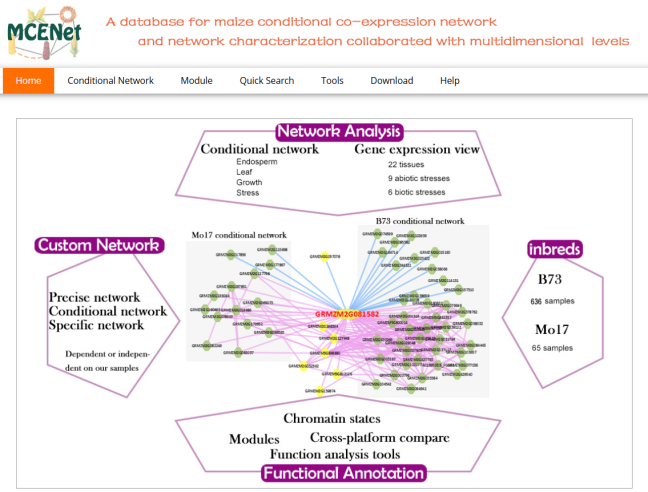 ☆?玉米多組學(xué)基因網(wǎng)絡(luò)分析平臺:整合了701個(gè)轉(zhuǎn)錄組學(xué)數(shù)據(jù)和108個(gè)表觀基因組數(shù)據(jù),并研究了具有多維組學(xué)水平的不同條件網(wǎng)絡(luò)。MCENet?還提供?5?個(gè)網(wǎng)絡(luò)訪問分析工具包(即?Network Search、Network Remodel、Module Finder、Network Comparison?和?Dynamic Expression View)和多個(gè)網(wǎng)絡(luò)功能支持工具包。