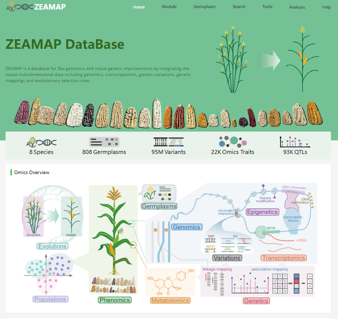 ☆?適應(yīng)玉米多組學(xué)時(shí)代的綜合數(shù)據(jù)庫:整合了來自于同一玉米群體的基因組、轉(zhuǎn)錄組、表型組、代謝組、表觀基因組、遺傳變異以及遺傳定位結(jié)果等多組學(xué)數(shù)據(jù),同時(shí)收錄了多個(gè)玉米基因組,可以進(jìn)行比較基因組、共線性分析、表達(dá)聚類、遺傳變異基因分型、連鎖圖譜、定位結(jié)果、組蛋白修飾以及甲基化等多組學(xué)數(shù)據(jù)進(jìn)行檢索和分析,實(shí)現(xiàn)在不同組學(xué)數(shù)據(jù)之間進(jìn)行跳轉(zhuǎn)。