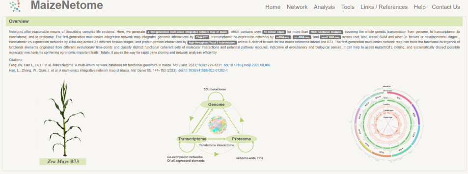 ☆?玉米網(wǎng)絡(luò)數(shù)據(jù)庫MaizeNetome:其中包含從基因組到轉(zhuǎn)錄組、翻譯組和蛋白質(zhì)組的整個(gè)遺傳傳遞。多組學(xué)整合網(wǎng)絡(luò)圖譜通過ChIA-PET整合基因組相互作用,包括跨根、葉、穗、?SAM和其它31個(gè)組織或發(fā)育階段mRNA-seq、circRNA-seq?的轉(zhuǎn)錄組共表達(dá)網(wǎng)絡(luò),跨?21?個(gè)不同組織/階段Ribo-seq?數(shù)據(jù),?B73?材料8?個(gè)不同組織的酵母雜交蛋數(shù)據(jù)。數(shù)據(jù)庫可以幫助輔助QTL定位,并系統(tǒng)剖析農(nóng)藝性狀的可能分子機(jī)制,為快速基因克隆和高效的網(wǎng)絡(luò)分析鋪平道路。