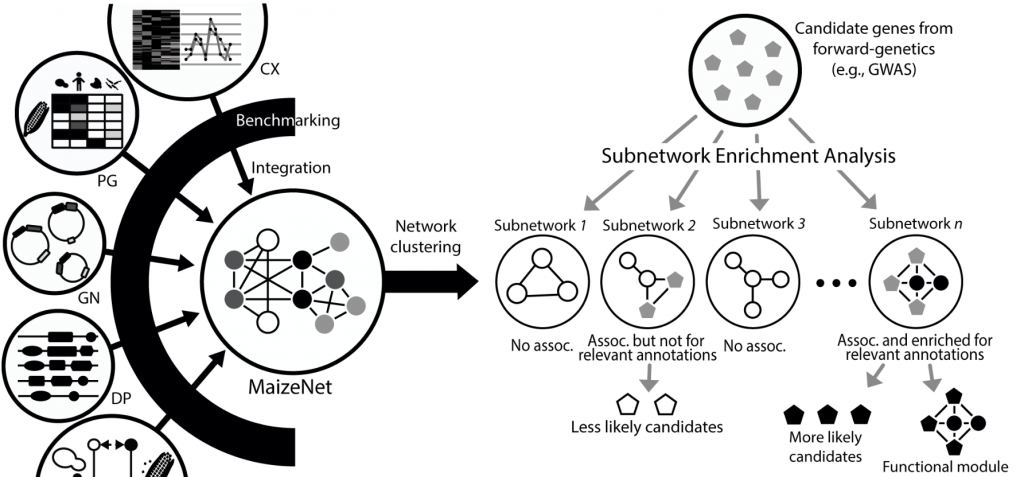 ☆?全基因組范圍的玉米基因輔助功能網(wǎng)絡(luò)數(shù)據(jù)庫MaizeNet:是通過集成?21?個(gè)組件網(wǎng)絡(luò)構(gòu)建的,其中每個(gè)網(wǎng)絡(luò)都是從不同的組學(xué)數(shù)據(jù)中推斷出來的。 通過整合異構(gòu)數(shù)據(jù),MaizeNet?提供了玉米遺傳結(jié)構(gòu)的全面視圖,為特定生物過程確定候選基因的優(yōu)先級。可以利用?MaizeNet?中實(shí)現(xiàn)的優(yōu)先級服務(wù)來生成新的功能假設(shè),縮小候選基因的范圍,并確定該功能的新基因。
