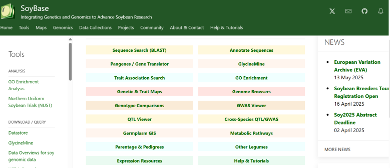 ☆?大豆基因組學(xué)和分子生物學(xué)數(shù)據(jù)庫:為大豆研究者提供了大量的數(shù)據(jù)和工具,以支持大豆的遺傳學(xué)、基因組學(xué)和育種研究。用戶可以通過SoyBase查找大豆的基因組信息、遺傳資源、表型數(shù)據(jù)等,并利用其中的分析工具進(jìn)行數(shù)據(jù)挖掘和可視化。