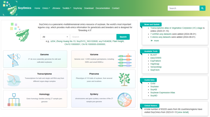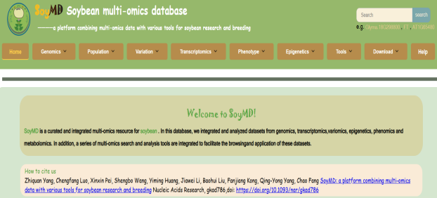 ☆?大豆多組學(xué)數(shù)據(jù)庫SoyOmics:從基因組、變異組、轉(zhuǎn)錄組、表型組等不同層面整合了大豆相關(guān)數(shù)據(jù)集,實(shí)現(xiàn)了不同層次組學(xué)數(shù)據(jù)的交互查詢和聯(lián)合比較分析。數(shù)據(jù)庫目前收錄了多個(gè)大豆品系的基因組組裝,注釋數(shù)據(jù),以高質(zhì)量的ZH13作為參考基因組,對2898份材料的全基因組測序數(shù)據(jù)進(jìn)行了全基因組序列變異檢測,鑒定到約3800萬條SNP/INDEL變異數(shù)據(jù),提供了來自大豆泛基因組分析的約55萬條結(jié)構(gòu)變異數(shù)據(jù)以及基于結(jié)構(gòu)變異構(gòu)建的圖泛基因組。收錄了多個(gè)品系不同組織時(shí)期的表達(dá)數(shù)據(jù)。數(shù)據(jù)庫針對115個(gè)表型多年多點(diǎn)測定的約2.7萬條表型記錄進(jìn)行了本體注釋和歸類,并將表型數(shù)據(jù)與變異數(shù)據(jù)進(jìn)行關(guān)聯(lián)。除以上組學(xué)數(shù)據(jù)外,數(shù)據(jù)庫同時(shí)提供了甲基化測序數(shù)據(jù),Soy40K大豆芯片數(shù)據(jù)。