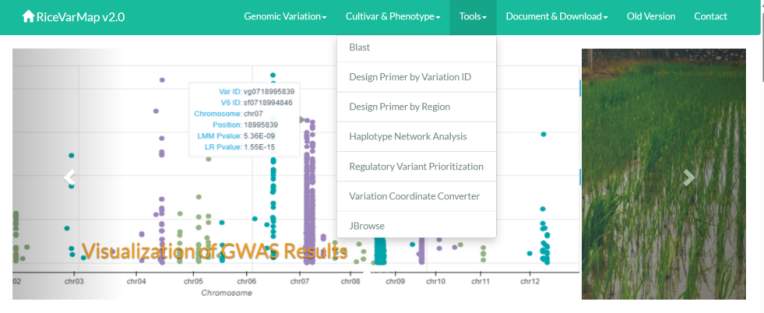 ☆?水稻基因組變異及其功能注釋的綜合數(shù)據(jù)庫RiceVarMap v2.0:提供了來自4,726個(gè)水稻種質(zhì)的測序數(shù)據(jù)中的17,397,026個(gè)基因組變異(包括14,541,446個(gè)SNP和2,855,580個(gè)小?INDEL)的精選信息,高質(zhì)量和完整的基因型數(shù)據(jù),變異的全面注釋,表型數(shù)據(jù)和?GWAS?結(jié)果,對功能基因定位,標(biāo)記開發(fā)的客戶非常友好。