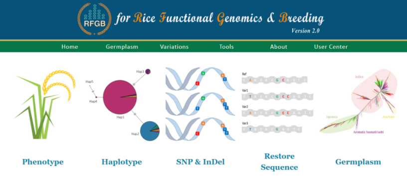 ☆?水稻功能基因組育種數(shù)據(jù)庫RFGB(v2.0):該數(shù)據(jù)庫整合了3024份水稻種質(zhì)資源的18M SNP、2.3M InDel、IRGSP所有基因單倍型和12種表型數(shù)據(jù),具有基因檢索、基因組變異可視化瀏覽、BLAST等功能,將表型數(shù)據(jù)和單倍型數(shù)據(jù)聯(lián)合分析,為挖掘基因有利單倍型提供數(shù)據(jù)支持。