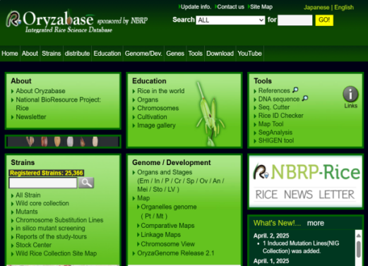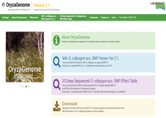 ☆?Oryzabase是一個(gè)綜合性水稻科學(xué)數(shù)據(jù)庫,包含大量水稻品系庫存信息,突變體信息,染色體圖譜,基因字典,水稻科學(xué)基礎(chǔ)知識。OryzaGenome是野生Oryza物種的基因組數(shù)據(jù)庫,為水稻研究提供了比較和進(jìn)化的組學(xué)方法。