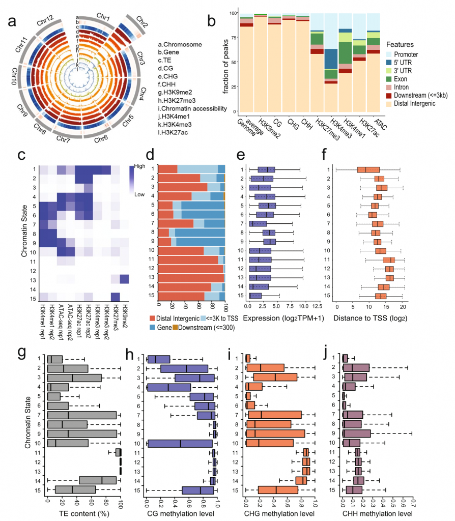 該研究以樟樹港辣椒為模型,系統(tǒng)揭示了辣椒在全基因組范圍內(nèi)的表觀特征,并在此基礎(chǔ)上推測包括啟動子和增強(qiáng)子在內(nèi)的瞬時(shí)調(diào)控元件。研究發(fā)現(xiàn),辣椒啟動子主要由H3K4me3,?H3K27ac和開放染色質(zhì)共同修飾,而增強(qiáng)子的特征為開放染色質(zhì)。在此基礎(chǔ)上,該研究對生長發(fā)育以及脅迫響應(yīng)的調(diào)控元件進(jìn)行了挖掘,并對部分元件進(jìn)行實(shí)驗(yàn)驗(yàn)證。此外,該研究報(bào)道了辣椒基因組基因間區(qū)H3K4me1H3K27me3共同修飾的區(qū)域,推測為暫時(shí)未表達(dá)(poised)的調(diào)控元件,其具體分子功能有待驗(yàn)證。