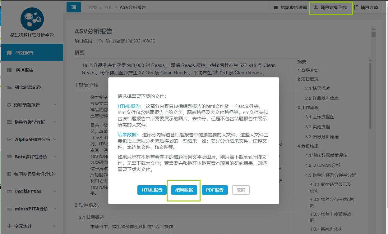 上述報(bào)告查找頁面 – 打開報(bào)告之后 – 點(diǎn)擊報(bào)告右上角 – 項(xiàng)目結(jié)果下載 – 選擇下載結(jié)果數(shù)據(jù)