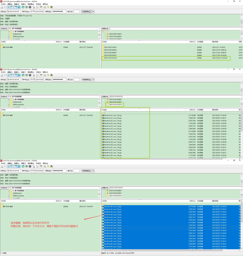打開 FTP 客戶端:依次填寫好上述主機(jī),用戶名,密碼,端口信息,打開之后選擇最新的文件夾,里面就是剛剛選中打包下載的數(shù)據(jù),然后直接選中數(shù)據(jù),拖拽到左邊目標(biāo)文件夾中即可。