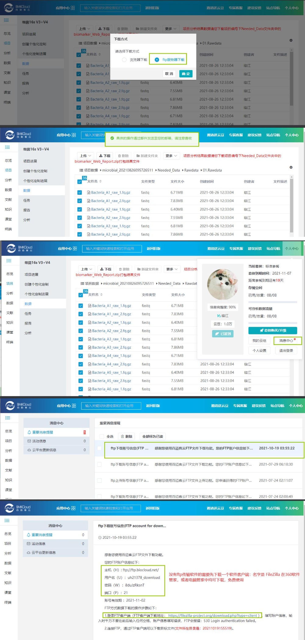 FTP 下載指導(dǎo):下載方式選擇 FTP 下載,平臺(tái)會(huì)將具體的操作步驟發(fā)到注冊(cè)郵箱賬號(hào)中,也會(huì)發(fā)到個(gè)人中心信息中,如下: