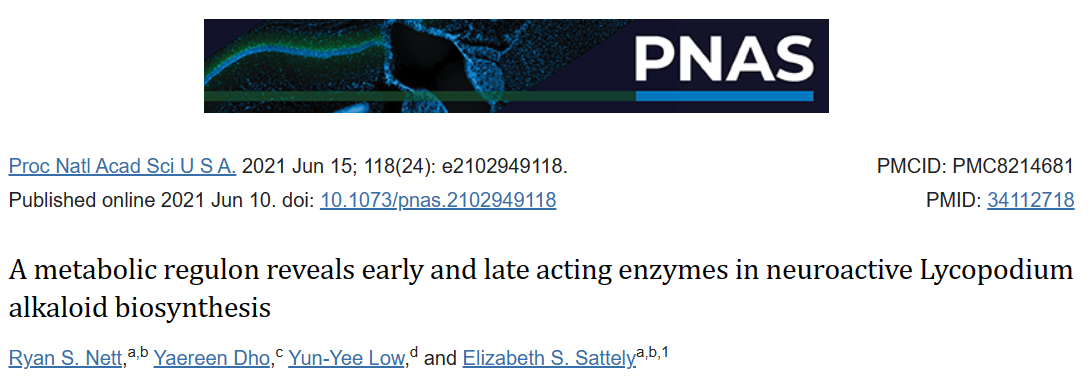 2021年6月,斯坦福大學(xué) Elizabeth S. Sattely 團(tuán)隊(duì)在國(guó)際頂尖學(xué)術(shù)期刊《美國(guó)國(guó)家科學(xué)院院刊》PNAS發(fā)表一項(xiàng)重要研究成果,題為:A metabolic regulon reveals early and late acting enzymes in neuroactive Lycopodium alkaloid biosynthesis。研究通過代謝組學(xué)和轉(zhuǎn)錄組學(xué)的方法,確定了一組發(fā)育受控的生物合成基因,或潛在的調(diào)節(jié)子,用于調(diào)控石松生物堿的生物合成。
