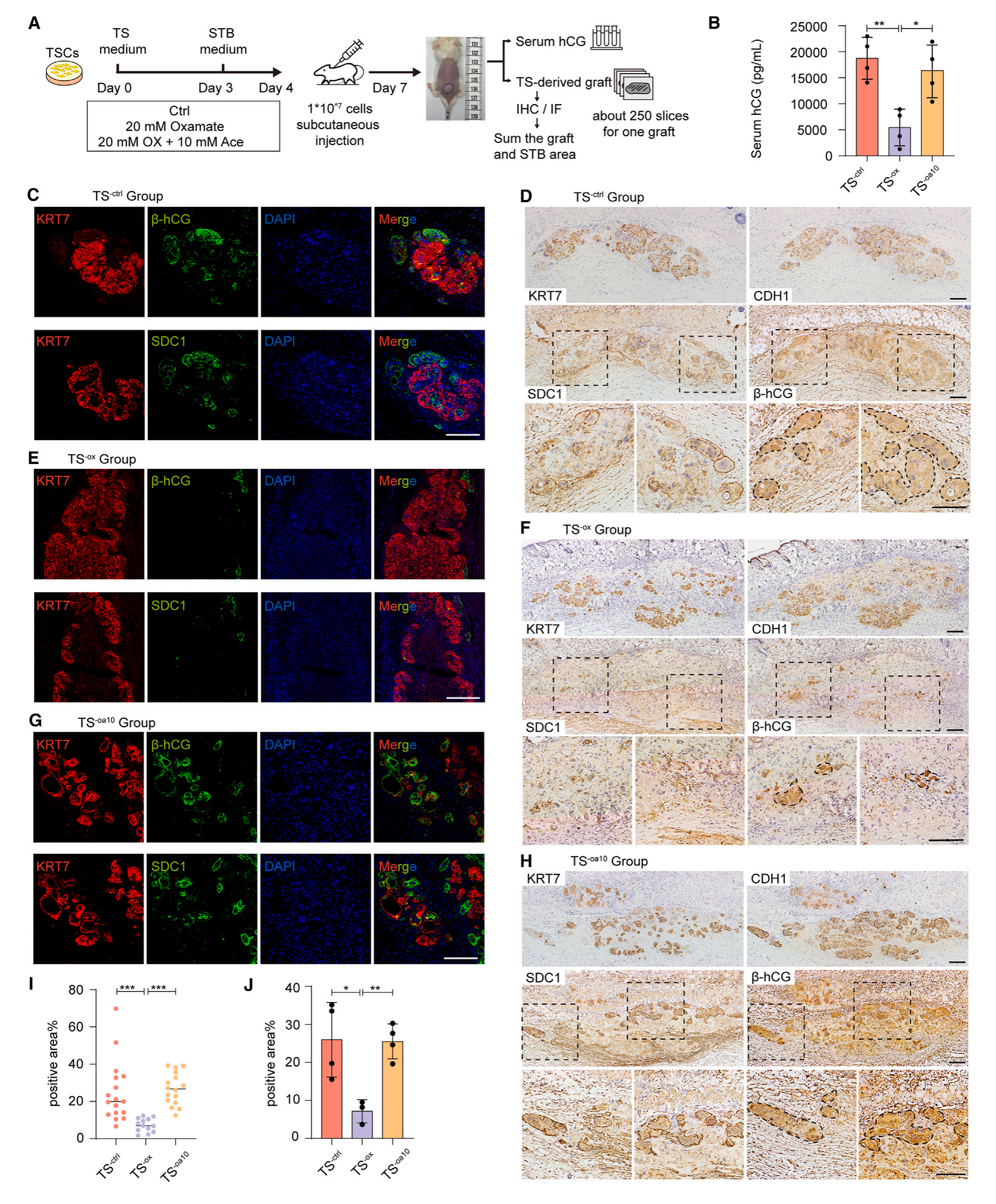 綜上所述,該研究表明,適當(dāng)?shù)囊宜釢舛瓤梢跃徑馓墙徒庖种茖?duì)合胞的抑制。草酸鹽的糖酵解抑制降低了STBs糖酵解乙酰輔酶A的基礎(chǔ)產(chǎn)生,從而降低了滋養(yǎng)細(xì)胞合胞過程中組蛋白乙酰化的水平。因此,適當(dāng)補(bǔ)充乙酸可以恢復(fù)細(xì)胞內(nèi)乙酰輔酶A的水平,從而恢復(fù)正常的蛋白質(zhì)乙?;貏e是組蛋白H3和H4乙酰化,并恢復(fù)正常的滋養(yǎng)細(xì)胞合胞(圖4J)。因此,糖酵解乙酰輔酶A的基礎(chǔ)水平對(duì)于調(diào)節(jié)組蛋白乙酰化和hTSC合胞是至關(guān)重要的。
