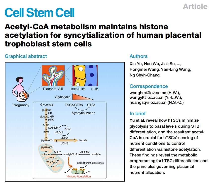 IF=19.8 | 中科院動(dòng)物研究所在Cell子刊發(fā)表重要研究成果 http://www.melodyktv.com.cn/archives/33264 Mon, 19 Aug 2024 06:17:21 +0000 http://www.melodyktv.com.cn/?p=33264 2024年7月30日,中國(guó)科學(xué)院動(dòng)物研究所在國(guó)際學(xué)術(shù)期刊Cell Stem Cell發(fā)表一項(xiàng)重要研究成果,題為:Acetyl-CoA metabolism maintains histone acetylation for syncytialization of human placental trophoblast stem cells。該研究通過表觀組學(xué)、轉(zhuǎn)錄組和非靶向代謝組學(xué)分析研究了人胎盤中原發(fā)性CTBs和hTSCs向STBs分化過程中葡萄糖相關(guān)的代謝組學(xué)特征,并揭示了CTBs和hTSCs從高糖酵解到STBs基礎(chǔ)糖酵解水平的轉(zhuǎn)變。