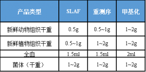 建議送樣量適用于95%的物種組織,少部分組織因胞內(nèi)核酸量較低,需適當(dāng)增加送樣量,比如植物果實(shí)、根等。送樣量過少或過多均不利于提取實(shí)驗(yàn),下限為建議量的一半,上限為建議量的3倍。隨著技術(shù)發(fā)展,當(dāng)前大部分產(chǎn)品建庫起始量較低,不需要太多組織,采樣量過多反而會造成速凍不徹底、提取取樣困難、凍融降解等危險(xiǎn)。
