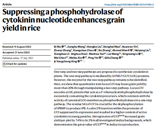 作者通過秈稻品種特青和粳稻品種02428構(gòu)建高級遺傳群體克隆了產(chǎn)量相關(guān)基因GY3,其啟動子區(qū)域的反轉(zhuǎn)座子插入增強(qiáng)了啟動子區(qū)域的表觀修飾,降低GY3表達(dá)量,從而減少細(xì)胞分裂素合成前體底物的無效消耗,提高體內(nèi)活性的細(xì)胞分裂素含量,增加每穗粒數(shù)和谷物產(chǎn)量。GY3可作為后期秈稻高產(chǎn)育種的重要目標(biāo)基因,推動產(chǎn)量提升。