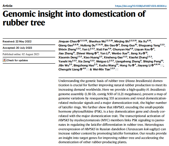 作者利用PacBio CLR+BioNano+Hi-C的方法構(gòu)建了橡膠樹參考基因組,結(jié)合127個栽培和208個野生品種重測序數(shù)據(jù)對其馴化的分子機(jī)制解析,同時(shí)通過208份橡膠樹種質(zhì)材料進(jìn)行GWAS分析,鑒定到一個調(diào)控乳管數(shù)量的馴化基因。此研究將為后期橡膠樹的高產(chǎn)育種提供了分子基礎(chǔ)。