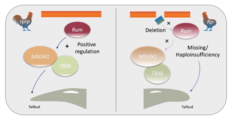 通過對包含家系內(nèi)特殊基因型個體的突變位點(diǎn)進(jìn)行綜合篩選和分析后,一個4.2 kb的缺失被確定與瓢雞的無尾表型完全相關(guān)。在對致因區(qū)間內(nèi)的基因表達(dá)結(jié)果進(jìn)行深入探究后,一個全新的基因Rum(長度大于22 kb,無內(nèi)含子),其表達(dá)呈現(xiàn)出無尾表達(dá)缺失,雜合子是顯性純合子表達(dá)量的一半的現(xiàn)象。深入研究發(fā)現(xiàn)Rum的表達(dá)具有胚胎特異性,研究人員認(rèn)為Rum的表達(dá)缺失以及雜合子中的單倍劑量不足,使其無法正常調(diào)控MSGN1基因長轉(zhuǎn)錄本以及TBX6等基因的正常表達(dá),進(jìn)而使得尾部骨骼發(fā)育出現(xiàn)異常。